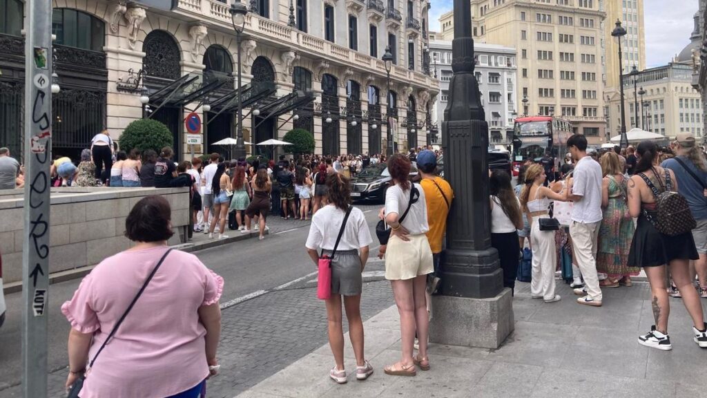 A primera hora de la tarde, seguía la vigilia que ya se había formado antes de la hora de comer y que obligó, como en la víspera, a cierto despliegue policial. Mientras los concentrados aguardaban expectantes, el equipo de la banda de K-pop abandonaba discretamente el hotel a bordo de media docena de monovolúmenes negros con los cristales tintados que salían por el túnel del aparcamiento subterráneo recayente a la calle Alcalá enfilando la ruta hacia el aeropuerto de Barajas.