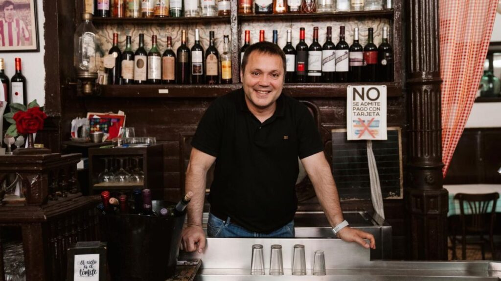 Ahora mismo, Tienda de vinos, o más bien El Comunista, es un negocio 100% familiar. El local, durante mucho tiempo alquilado, lo acabaron comprando los padres de Ángel, y ahora mismo trabajan en él cuatro personas: Carmen, su madre, y Cristina, su mujer, están en la cocina. Él se ocupa de la sala, y su hermano David le echa una mano. Ángel tuvo un infarto hace poco, así que está intentando bajar el ritmo. Ya no abren por las noches, por ejemplo, y este verano el local está cerrado durante varias semanas. Es un trabajo duro: tiene una hija y no quiere que se dedique a esto. Él, que lleva trabando aquí desde los 15 años, y su madre siguen por ahora porque les gusta y porque no sabrían hacer otra cosa. ‘Mi padre paró y duró dos años’, dice con una media sonrisa irónica. Pero no descarta dejarlo cuando no pueda más.