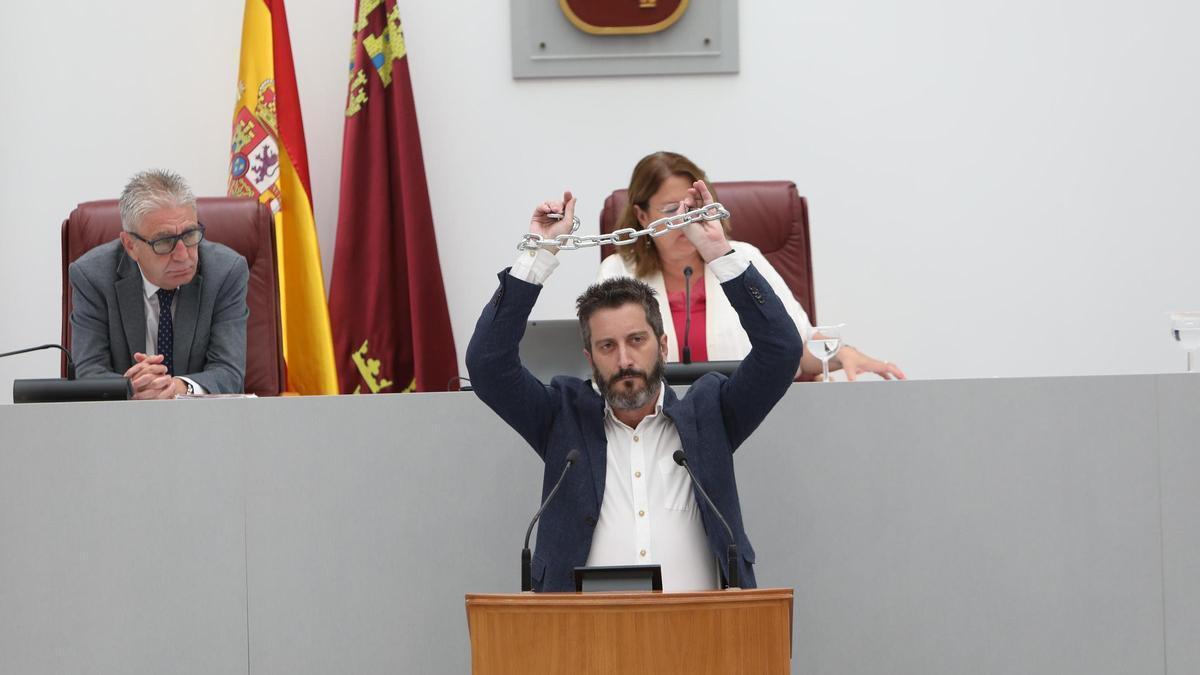 PP y Vox han votado juntos la expulsión del diputado de Podemos Víctor Egío durante un mes en el pleno de la Asamblea Regional de Murcia celebrado esta mañana. El primer parlamentario sancionado por la Cámara en toda su historia ha concluido su intervención en silencio y con las manos encadenadas como señal de protesta. ‘Seguiré hablando mientras no me corten la lengua’, ha dicho.